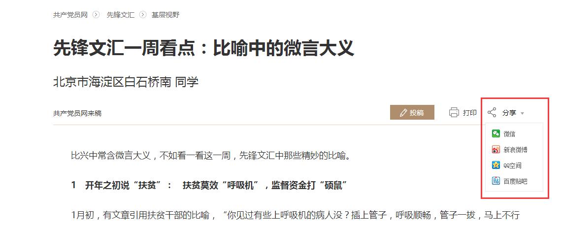 投稿系统拥有分享功能。鼠标滑动到已发布稿件的标题右下方“分享”按钮处,可将稿件分享到腾讯微信、新浪微博、qq空间、百度贴吧(如图10)。