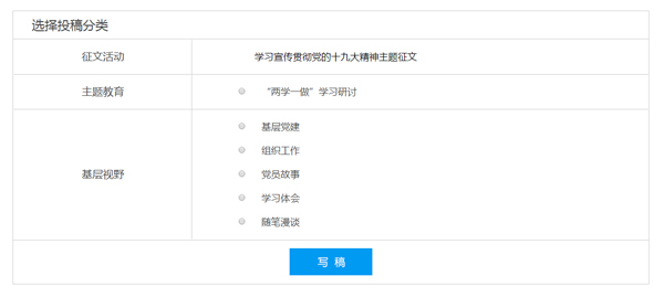 注册用户登录后,点击“我要投稿”按钮,首先选择自己作品的投稿分类(如图5)。共产党员网主要接收主题教育和基层视野两大类投稿,请选择自己作品的相应分类进行投稿,一次仅能选择一个分类,分类选择完毕,点击“写稿”按钮,进入写稿网页。